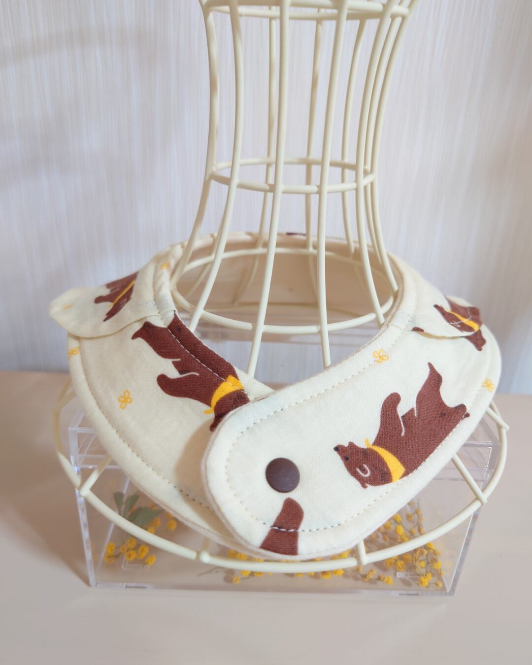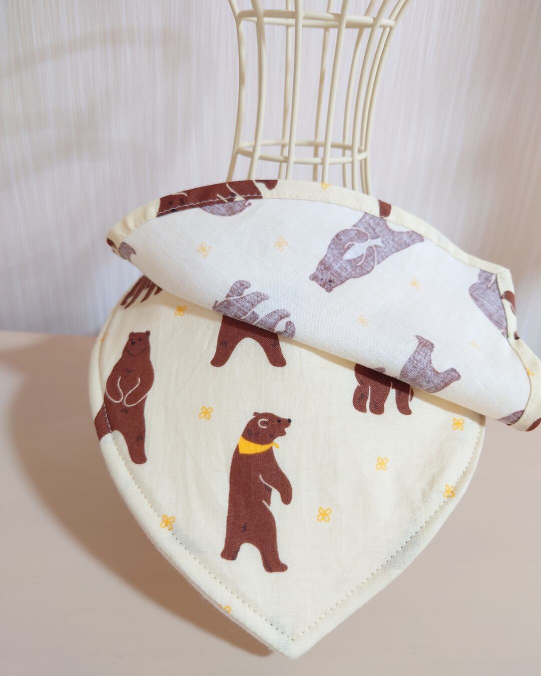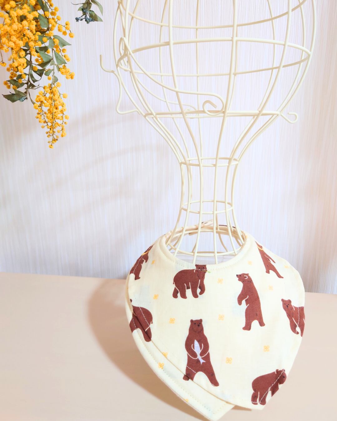 甘くなりすぎず、かわいいスタイリングにぴったりのおでかけスタイ。すべて手作りで作られているため、心を込めて作られたその手触りも魅力的です。